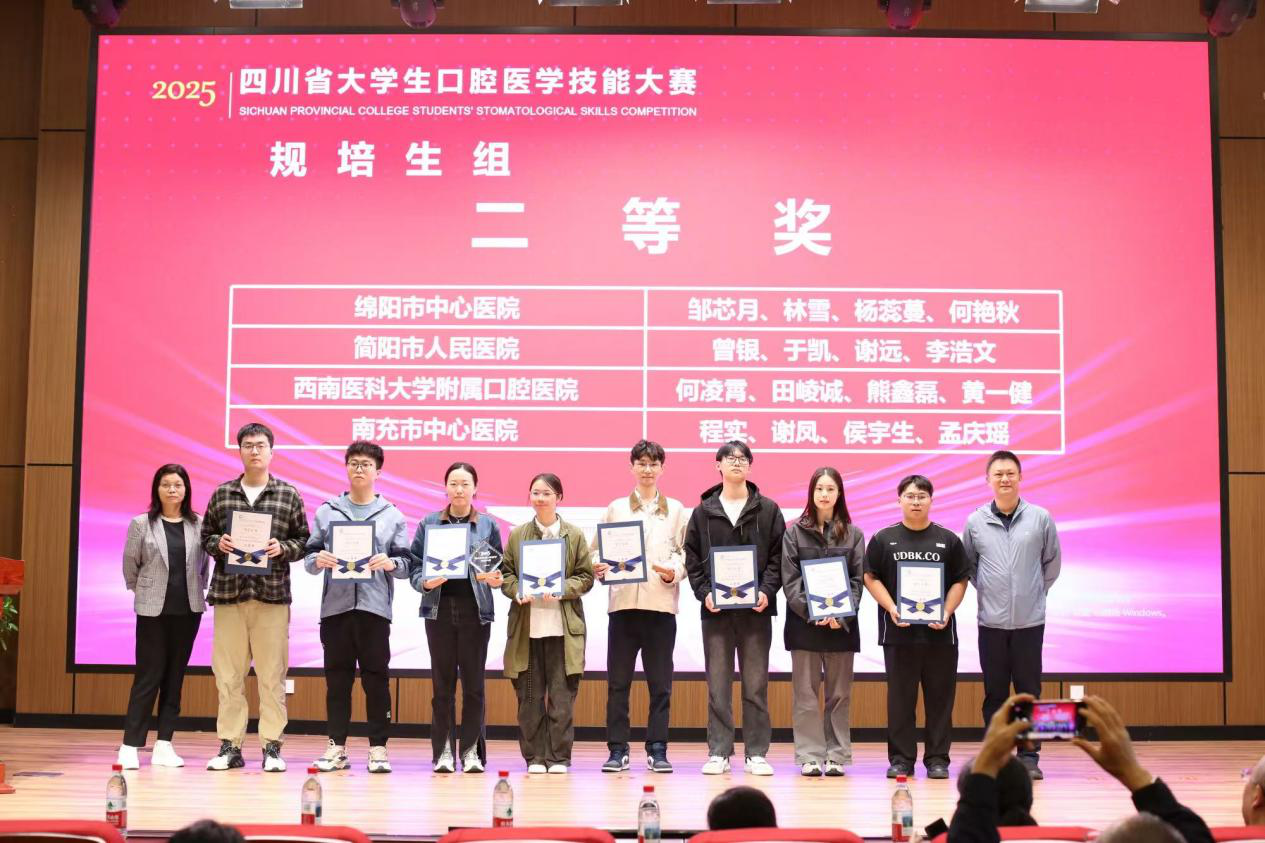 近日,从“2025年四川省大学生口腔医学技能大赛”现场传来捷报。由我院口腔全科基地规培学生谢凤、侯宇生、孟庆瑶、程实组成的参赛团队(第15组),在吕宗凯副主任及基地全体老师的悉心指导下,凭借扎实的临床功底、出色的临场发挥和卓越的团队协作,从众多强劲对手中脱颖而出,荣获大赛二等奖,充分展现了我院规培医师的卓越风采与专业实力。