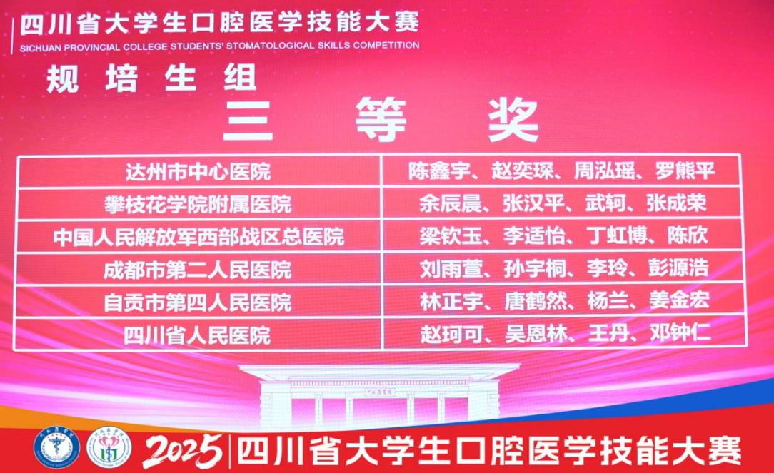 近日,由四川省教育厅主办的2025年四川省大学生口腔医学技能大赛在川北医学院成功举办。达州市中心医院口腔全科专业基地参赛团队凭借扎实的专业功底和出色的团队协作,从众多参赛队伍中脱颖而出,相继在个人奖项、团队奖项中,以第一名的成绩斩获大赛“规培组第三赛道优胜奖”和“规培生组三等奖”